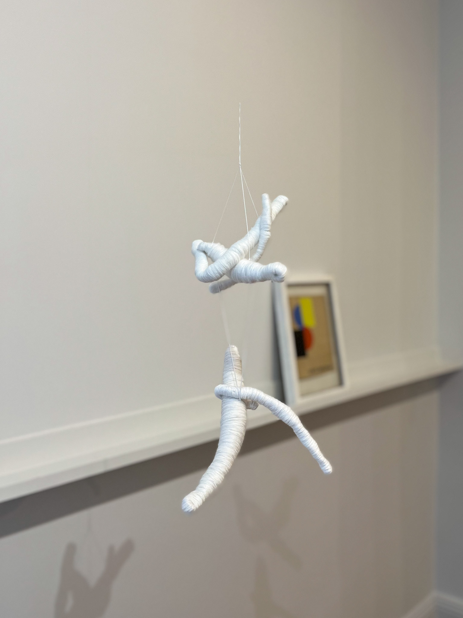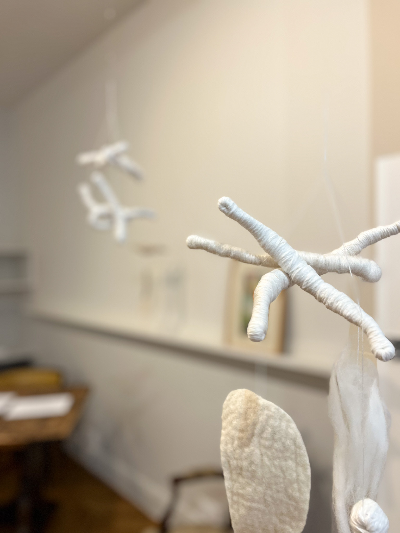Sonia Delaunay, artiste majeure du XXe siècle, s’est incarnée dans une recherche novatrice sur la couleur et son mouvement abstrait, explorant autant la peinture que le design textile. Plus d’un siècle plus tard, Viviane Sagnier, plasticienne, poursuit son travail autour de la couleur blanche, vue non pas comme une non-couleur, mais comme l’immense champ des possibles de la vibration de la matière. Dans la série des Mobiles qu’elle présente en exclusivité pour l’occasion, elle articule la figure racinaire, qui traverse tout son travail, avec des formes issues de dessins de Delaunay."