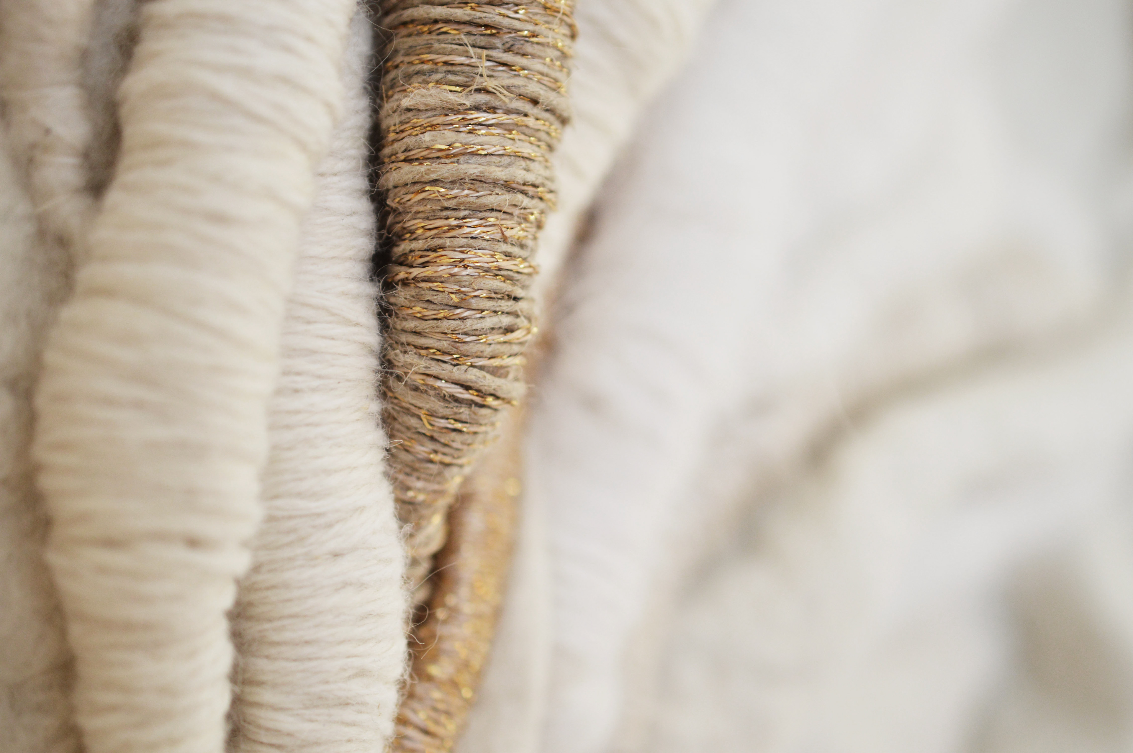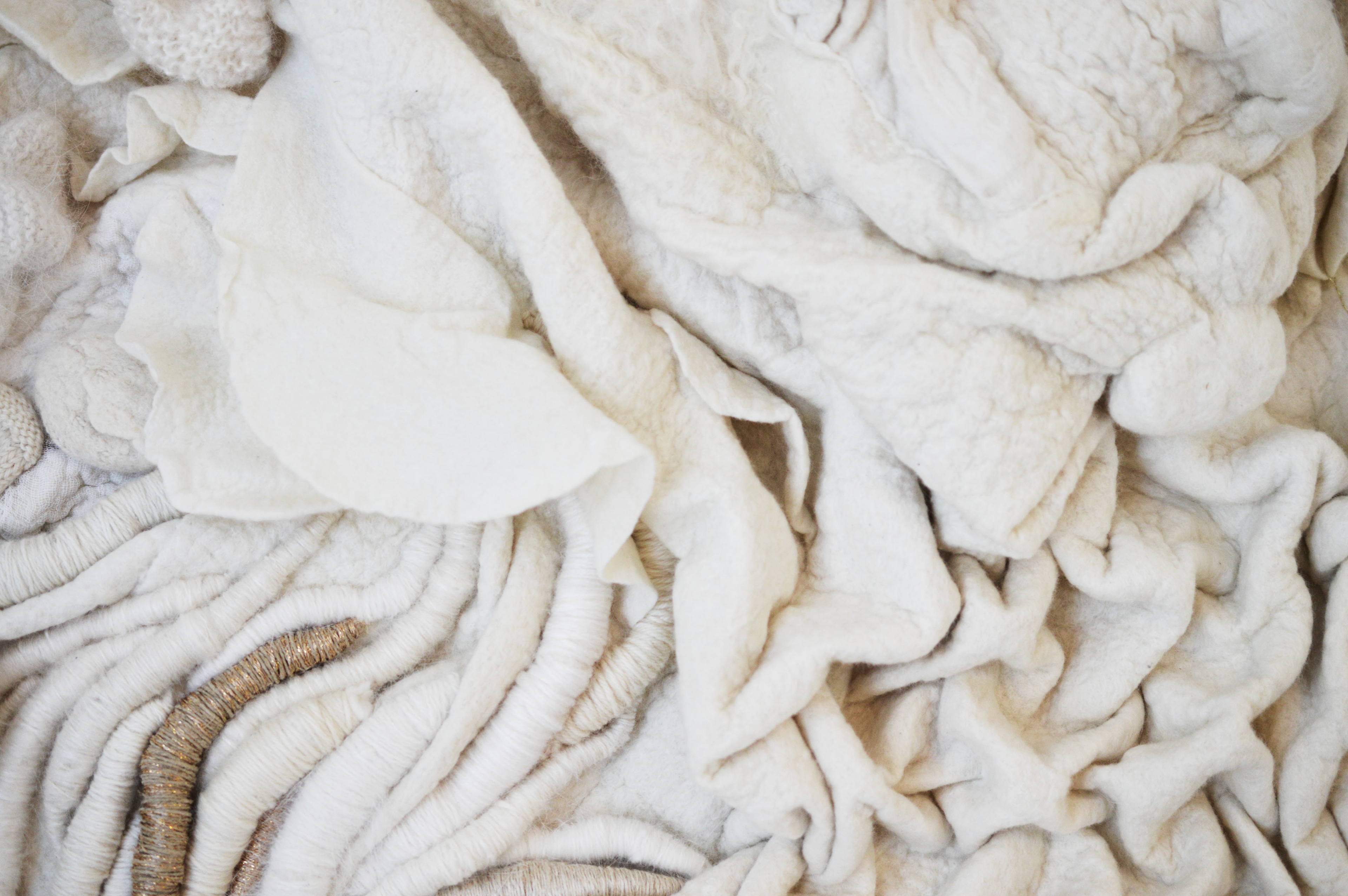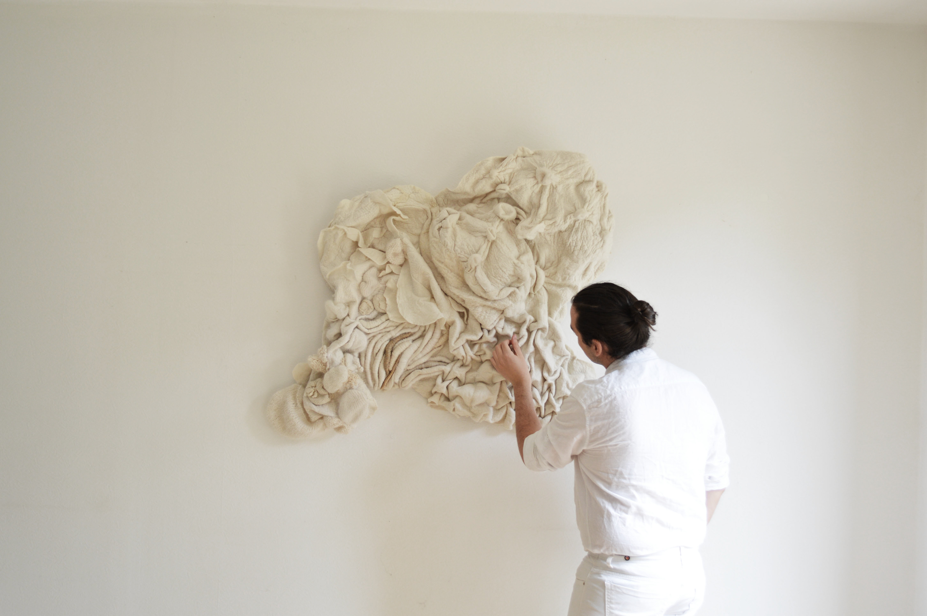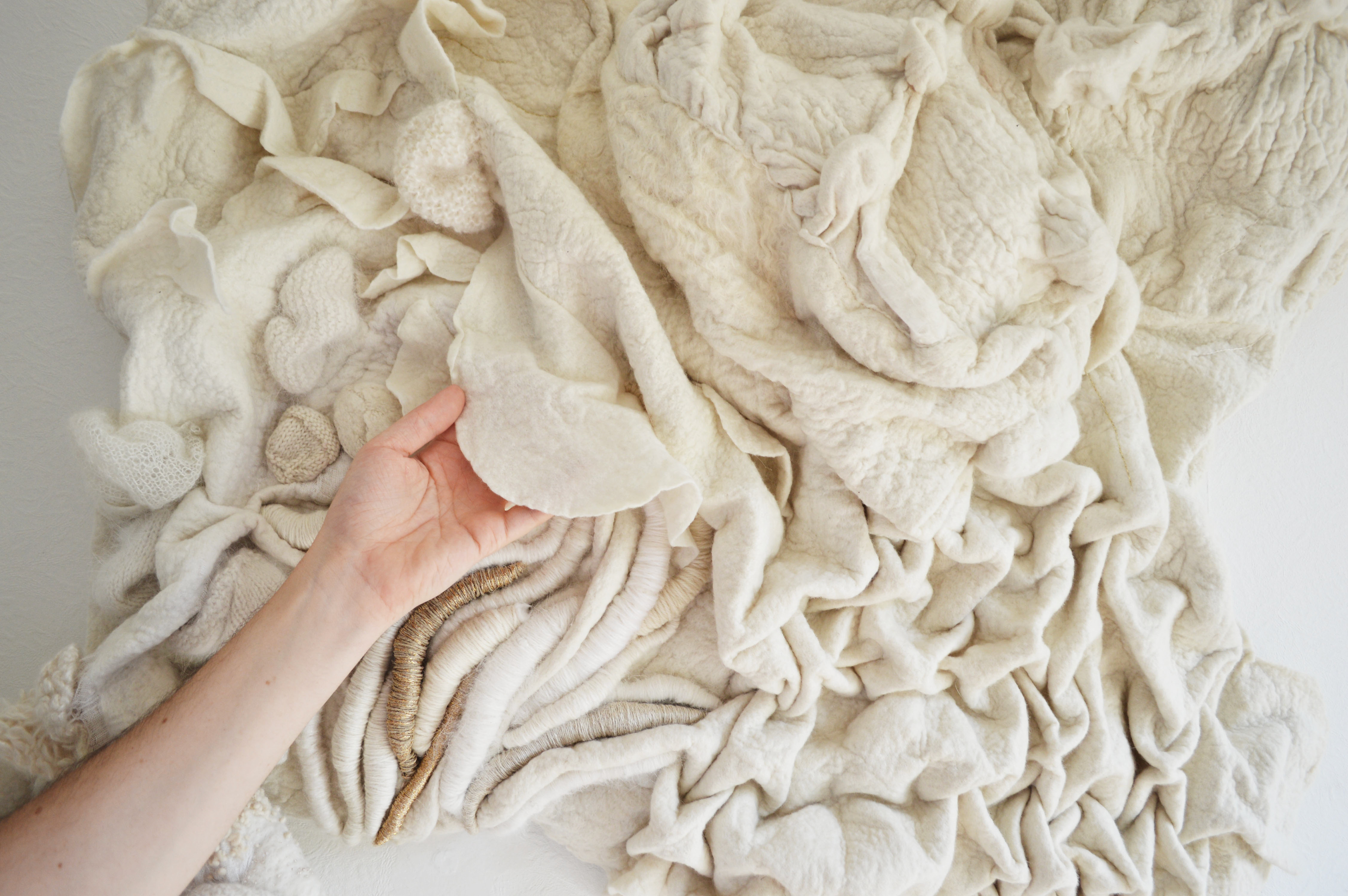 Feutre de laine fait à la main par l’artiste, fils (laine, soie, coton, lin, lurex, chanvre), châssis.