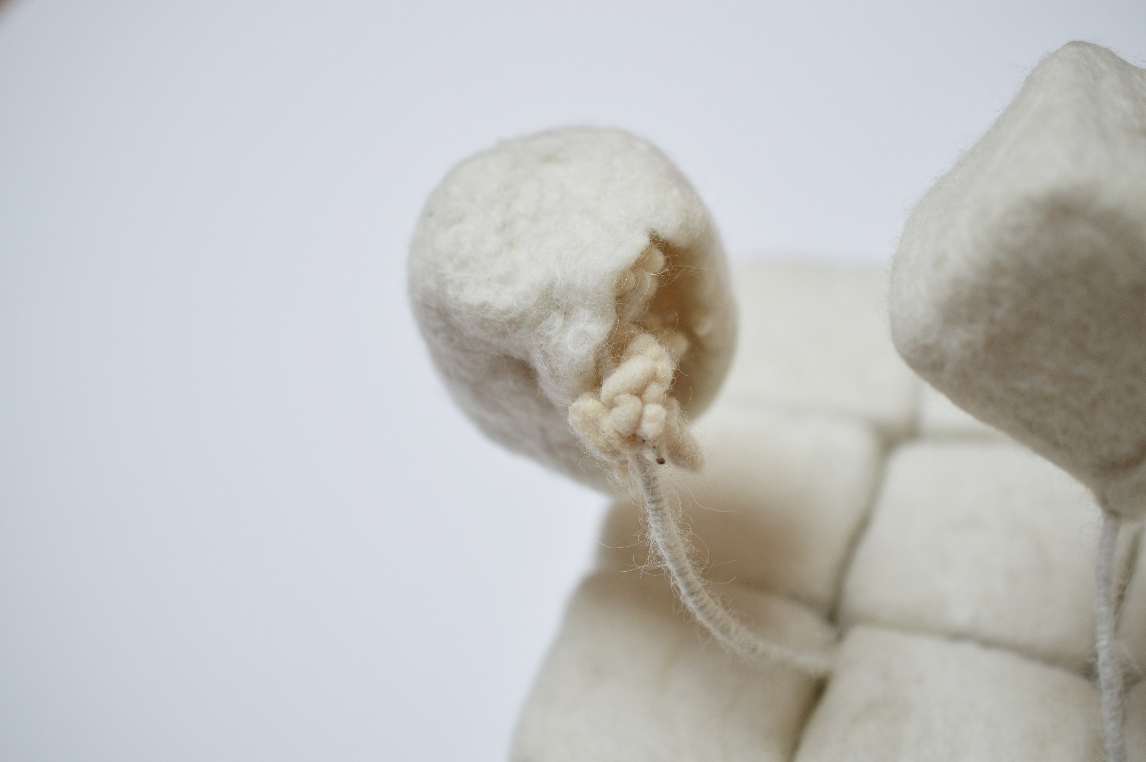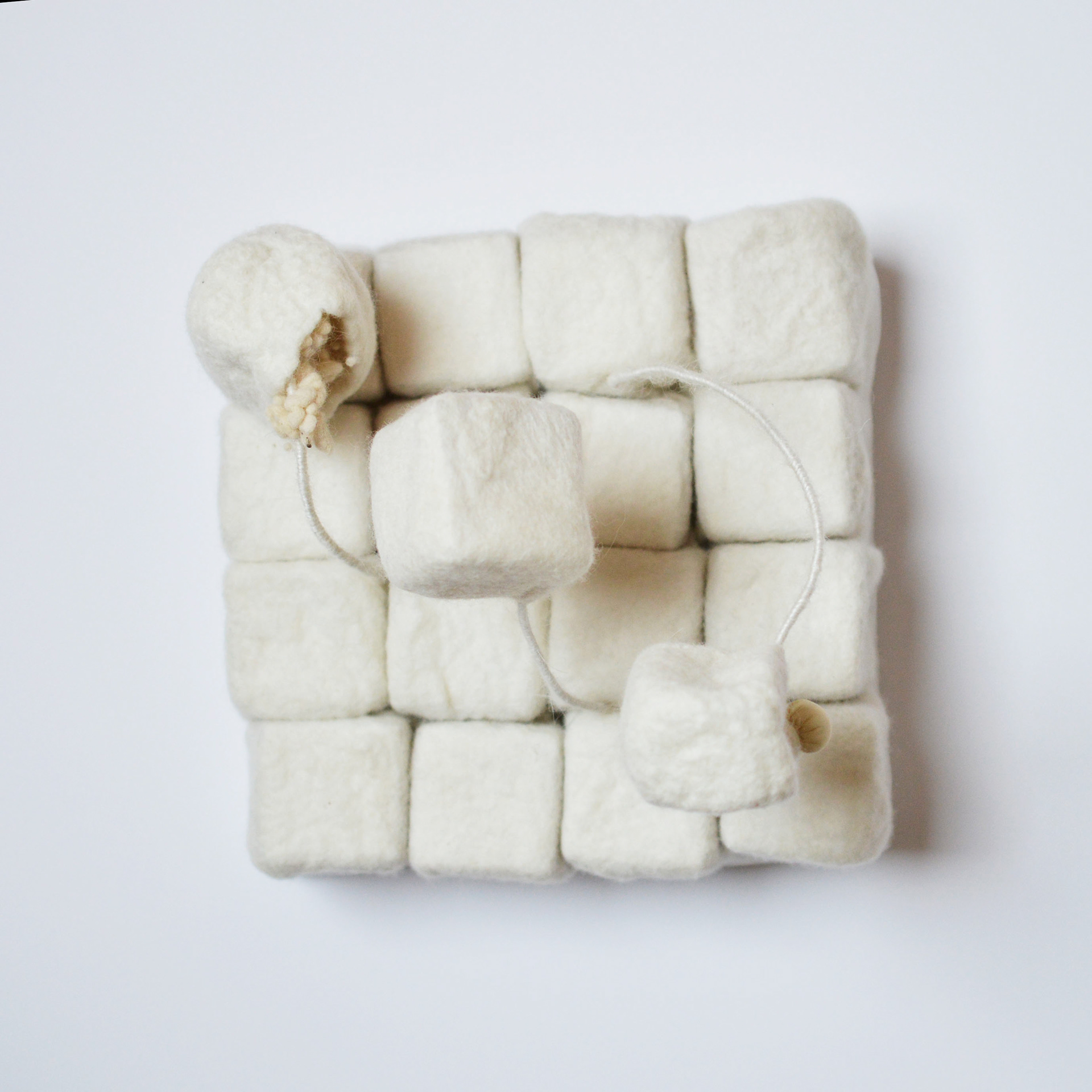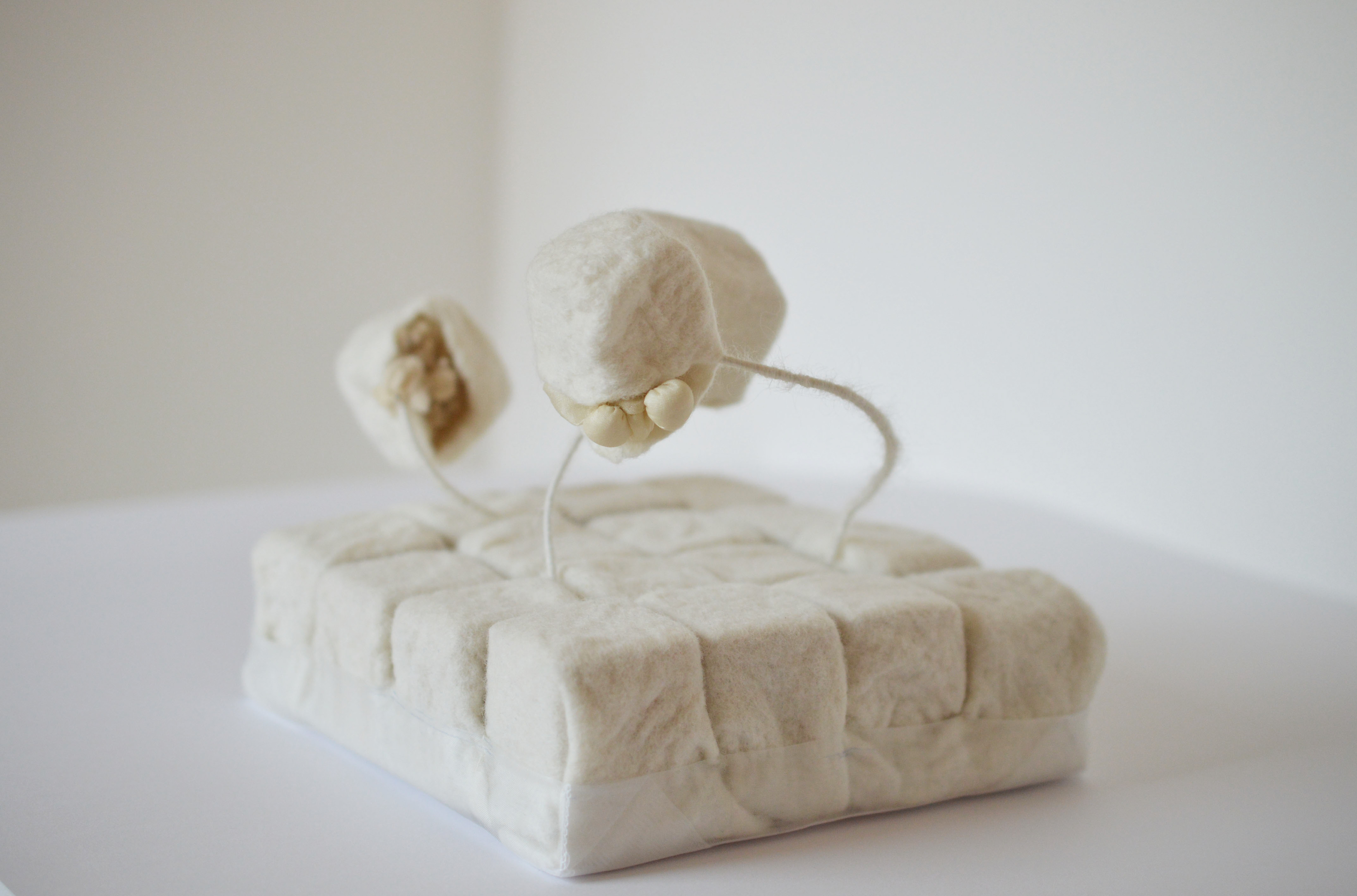 Sur une base de feutre, d’une surface de cubes, trois modules jaillissent, pop, cachant des entrailles de laine ou de soie. Qu’est ce qui naît, alors ?